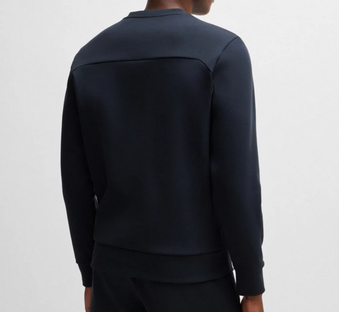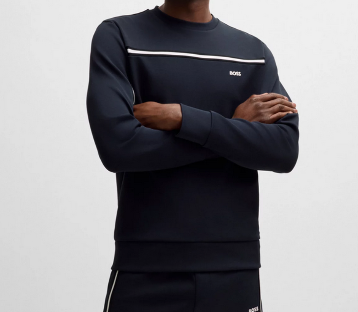 A signature sweatshirt with a molded logo and tape inserts by BOSS. This layer is cut to a straight fit in stretch cotton.